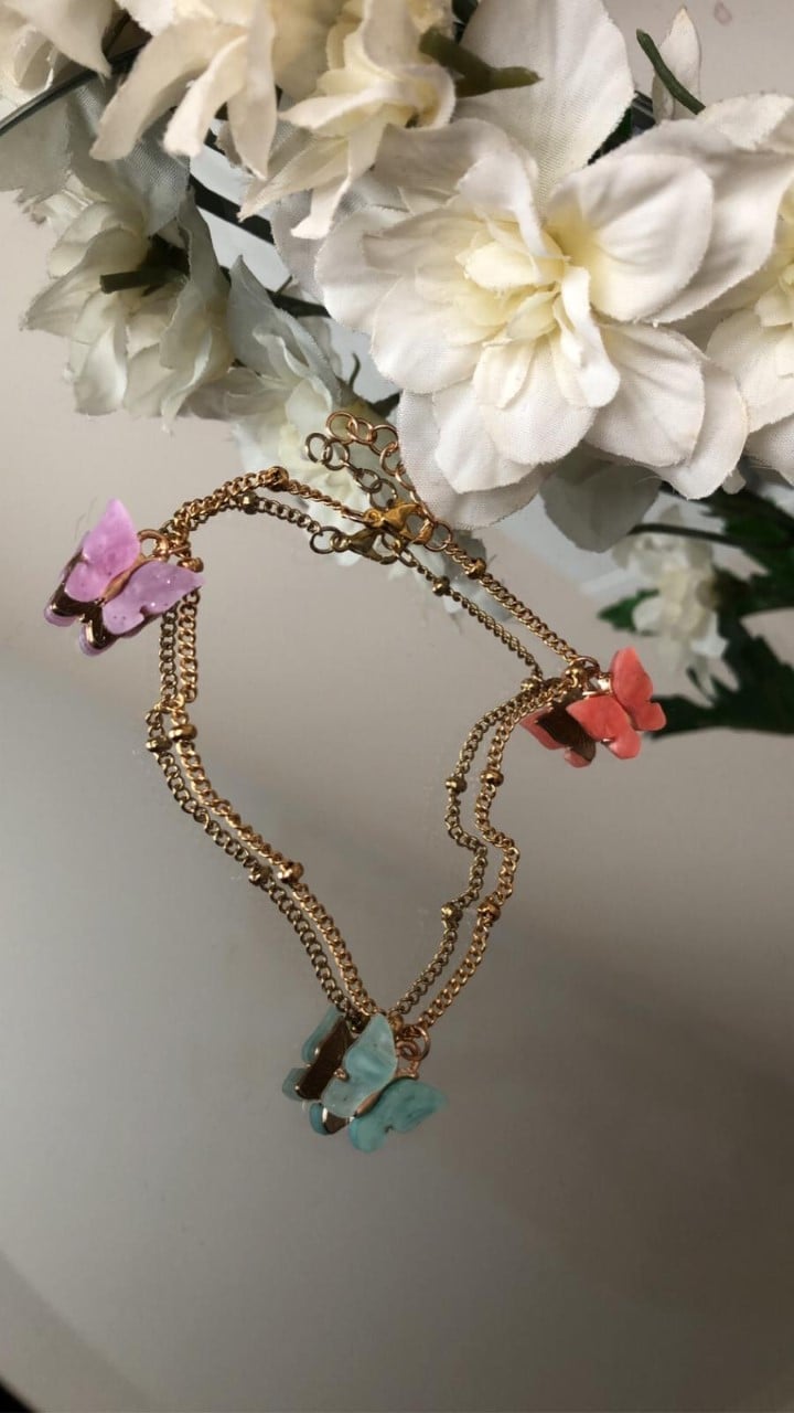 Beautiful gold chain anklet that can be worn as well as a bracelet. Can be customized (just mention the colour/number of butterfly pendants you'd like at the checkout under the section ''notes or instructions'')